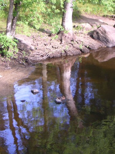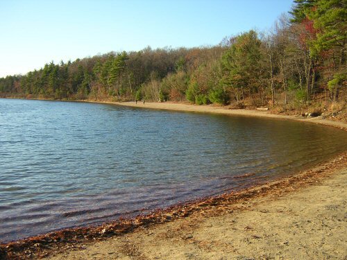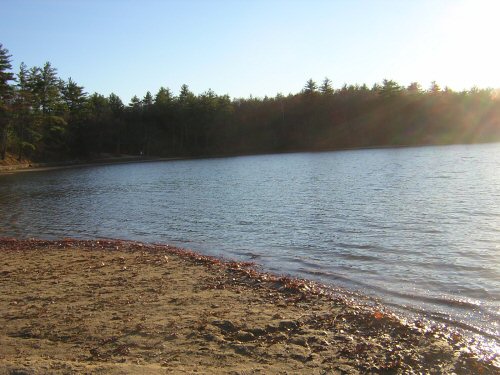 I think Concord is a positive energy vortex, a positive energy sacred site.  So much that is positive has come from Concord: the American Revolution, and writers such as Thoreau.  A famous natural site in Concord is Walden Pond, which is a state park, and I think it is a positive energy vortex, and a great place to visit.  You can walk around the pond, which is about a two mile walk.  It is shown in two photos below (Photos by T. Chase):