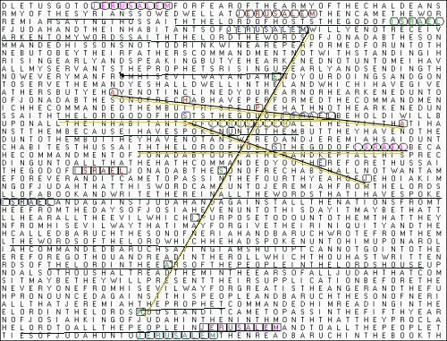 Note that MESSIAH and JESUS form a cross shape, and MESSIAH and ALPHA form a cross shape, with THE LORD OF HOSTS THE GOD OF ISRAEL and THE LORD GOD OF HOSTS THE GOD OF ISRAEL at the cross intersections. There are many phrases in this matrix that may relate to Christ, including this passage, which could be about the Bible's New Testament: