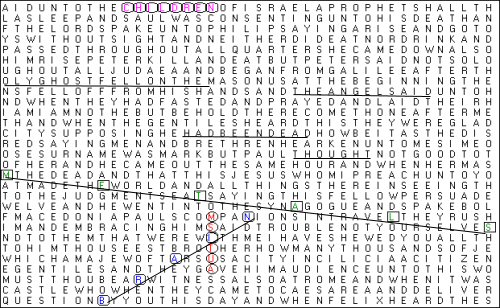 By using Bible code software I searched for some words in the King James New Testament and Old Testament (separately). I found that there is evidence of English Bible code patterns that the software found by skipping varying intervals, in the King James Old Testament or New Testament, made into a block of solid text. Look at the search words as well as other words I have underlined in the matrix.