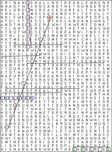 The first matrix is in the New Testament, at Luke 13:24 - Acts 28:4, and it includes these search words: