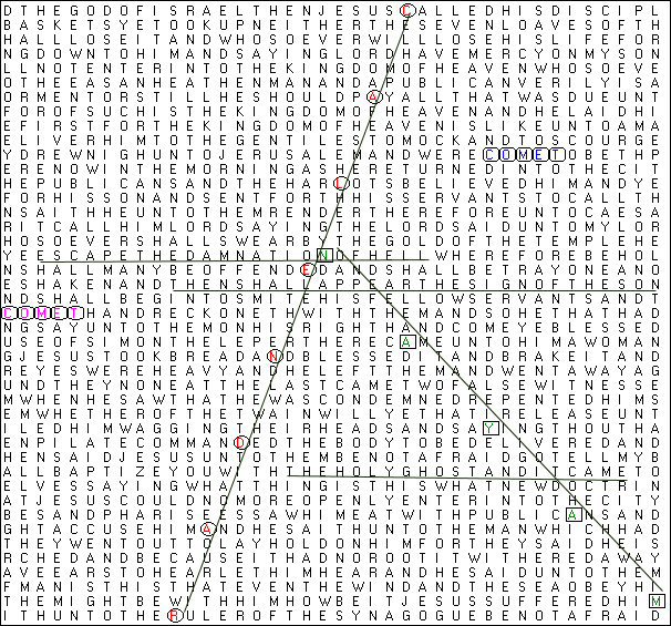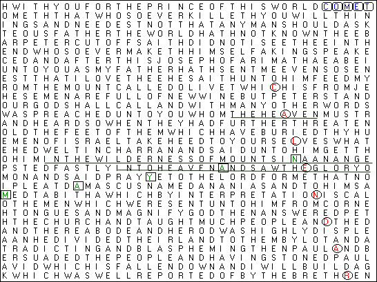 Both of these are New Testament matrices, and they seem to have a "Return of Christ" theme. This first matrix is at John 14:30 to Acts 16:2, and has ELS (skip) = 7708. The search words were: CALENDAR, MAYAN, COMET, to try to get a matrix related to the Mayan calendar date Dec. 2012. Also in this first matrix: