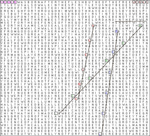 The first Bible Code matrix I found in the New Testament at Galatians 4:23 - 1 Peter 5:2, and it used as search words: