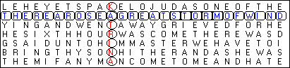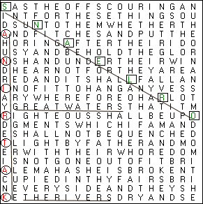 The "Bible Code" is a way of looking for hidden prophecies and passages in the Bible, by using a software program to search for messages in the Old Testament Hebrew text. The spaces between words are eliminated, so that the Old Testament is a continuous block of Hebrew letters. Then, by skipping letters at a programmed interval, the program searches for words. There appear to be patterns to the passages where the words are found, and what words are clustered together. The Bible Code also works in English in the King James Bible, as I show with the Bible Code matrices on this site. This page 8d on the Bible Code includes matrices on Hurricane Katrina, a very destructive August 2005 hurricane which hit hard Florida, Louisiana, Mississippi, and Alabama.