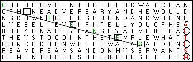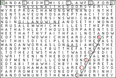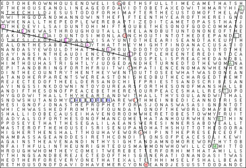 By using Bible code software I searched for some words in the King James New Testament and Old Testament (separately). I found that there is evidence of English Bible code patterns that the software found by skipping varying intervals, in the King James Old Testament or New Testament, made into a block of solid text. Look at the search words as well as other words I have underlined in the matrix.