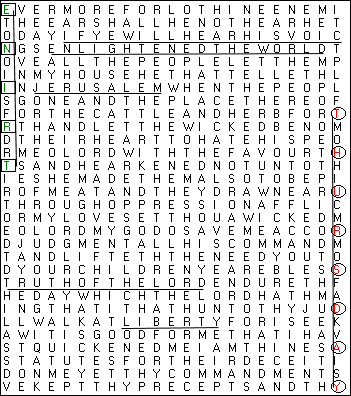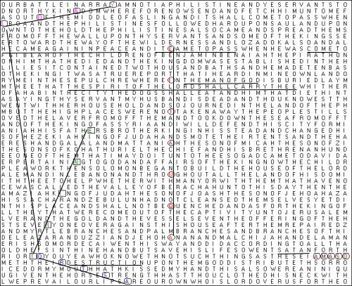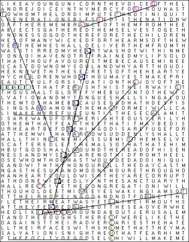 The next matrix is similar, but contains more words, and is at Psalm 94:4 - 136:6, ELS=4332, and contains search words: