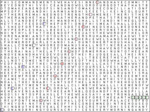 By using Bible code software I searched for some words in the King James New Testament and Old Testament (separately). I found that there is evidence of English Bible code patterns that the software found by skipping varying intervals, in the King James Old Testament or New Testament, made into a block of solid text. On this page I show a matrix on the New Madrid fault line. This matrix resulted from an Old Testament search for words: NEW MADRID, QUAKE, FIRES (which would result from the earthquake). This matrix is Old Testament at Daniel 9:4 - Amos 4:4. Also in this matrix: