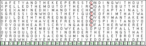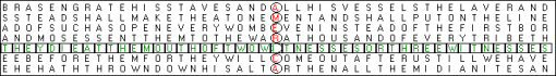 The next Bible Code matrices are an attempt to determine if the Two Witnesses, or one of them, are in the U.S.. Row Splitting was disabled in these matrices (an option when using Codefinder Bible Code software). It was a search for AMERICA as keyword, and also TWO WITNESSES, in the Old Testament. The first matrix is at Exodus 35:16 - Judges 6:33, and it includes: