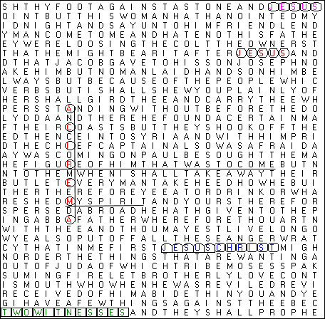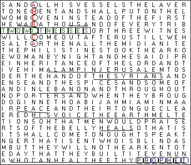 This page 1d on the King James Bible Code discusses research I did on an English Bible code in the King James version Bible, where I searched for matrices concerning the Two Witnesses, two prophets described in the Bible's New Testament Book of Revelation chapter 11. Also see the other pages on the King James Bible Code: